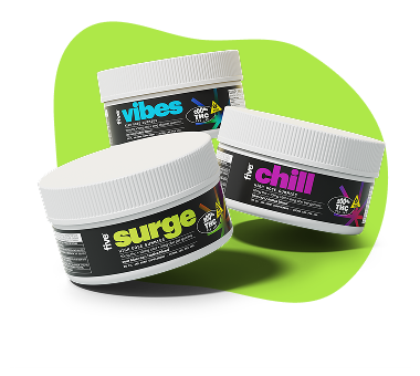 Container of The Vibes product with text: The vibes, 100% THC, 100mg THC, 10mg THC per serving