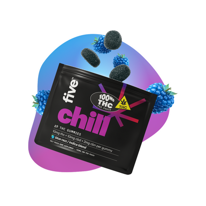chill with five gummies, crafted with 10mg delta-9 thc and other cannabinoids to deliver a couch-locking, fully powered buzz. enjoy the soothing blue razz flavor and elevate your downtime.