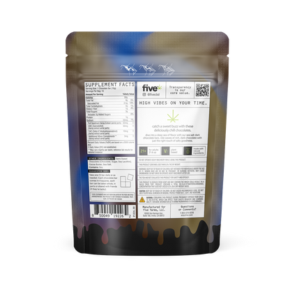 dive into high vibes with five's sea salt dark chocolate squares, crafted with 10mg delta-9 thc and other cannabinoids for a deeply relaxing buzz. enjoy the perfect balance of rich dark chocolate and a sprinkle of sea salt for a superior flavor experience.