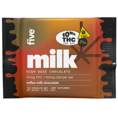 dive into high vibes with five's toffee milk chocolate squares, crafted with 10mg delta-9 thc and other cannabinoids for a deeply relaxing buzz. enjoy the sweet mix of creamy milk chocolate and crunchy toffee for a superior flavor journey.